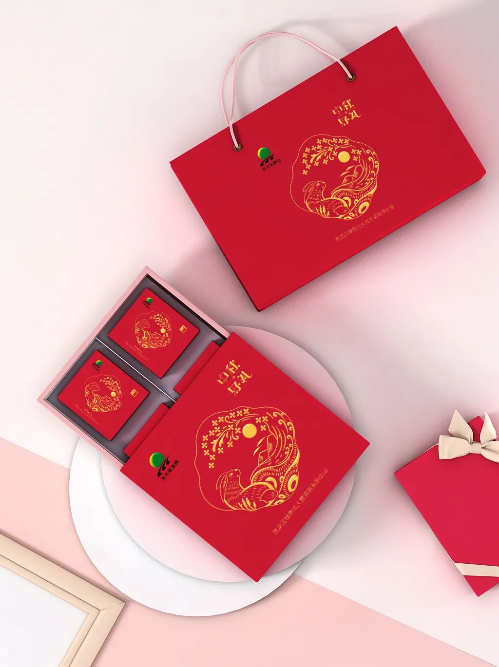 【唐门方案】:望月礼盒采取中国节日传统颜色-红色作为主色调。手绘玉兔又突显年轻化,整体画面烫金工艺,简洁又不失高档。